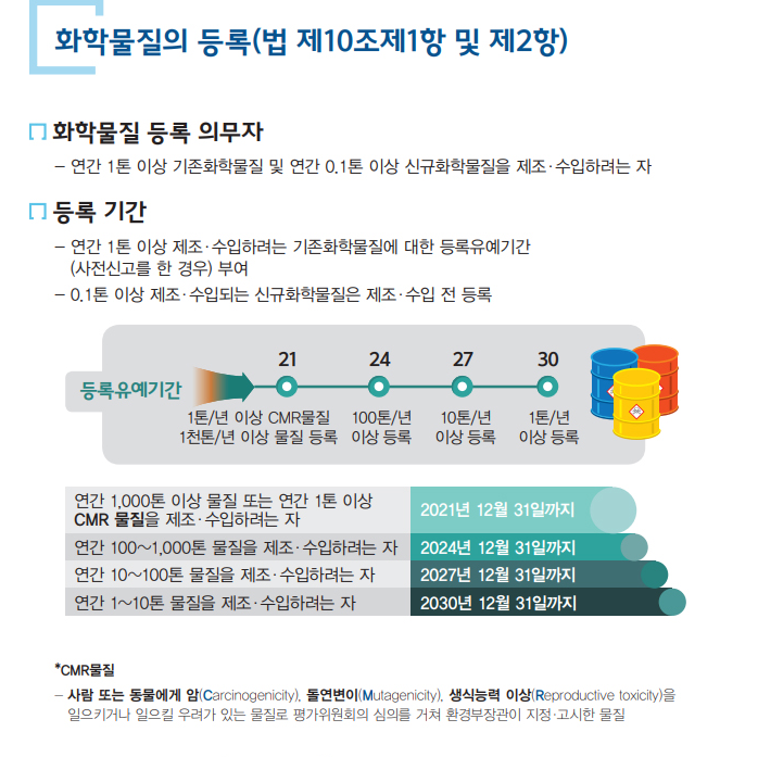 아래 그림과 같이 2021년 12월31일까지는 연간 1,000톤 이상 물질 또는 연간 1톤 이상 CMR물질(사람또는 동물에게 암,돌연변이,생식능력 이상을 일으키거나 일으킬 우려가 있는 물질로 평가위원회의 심의를 거쳐 환경부 장관이 지정 고시한 물질) 제조 수입하려면 등록해야 한다.